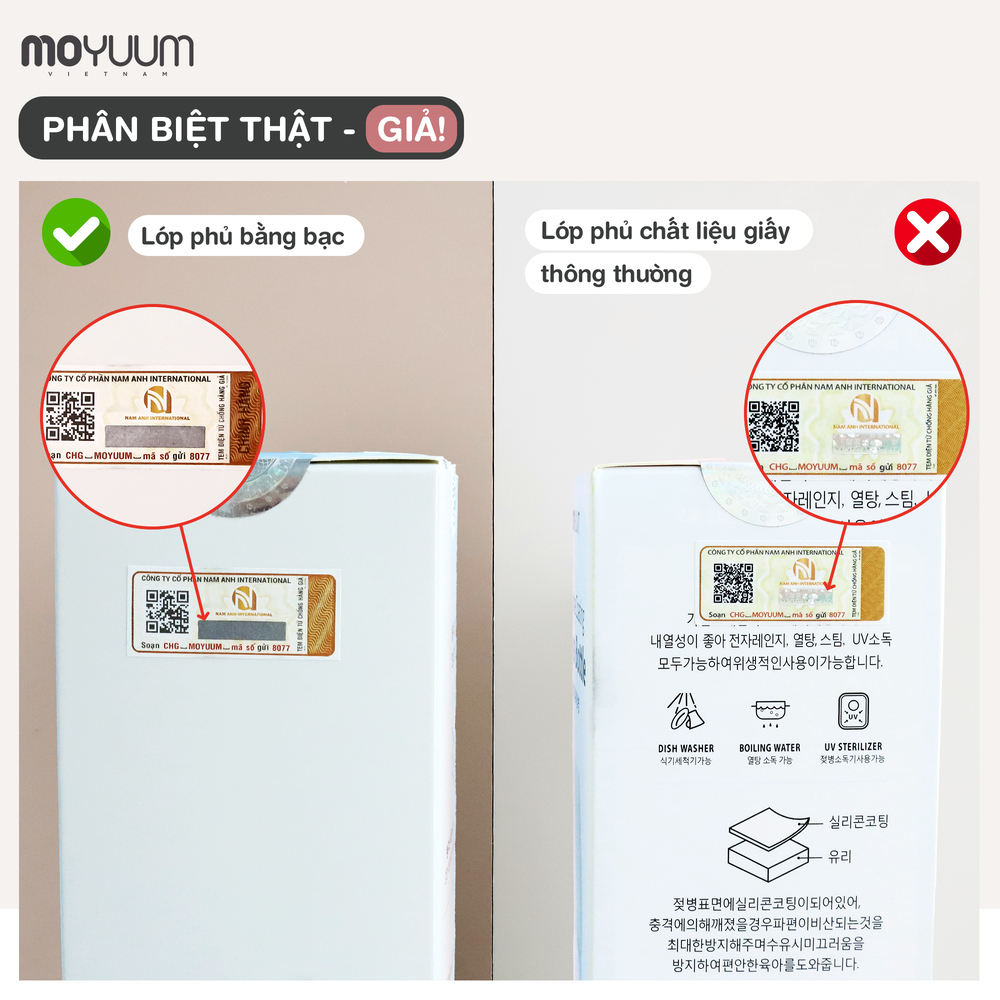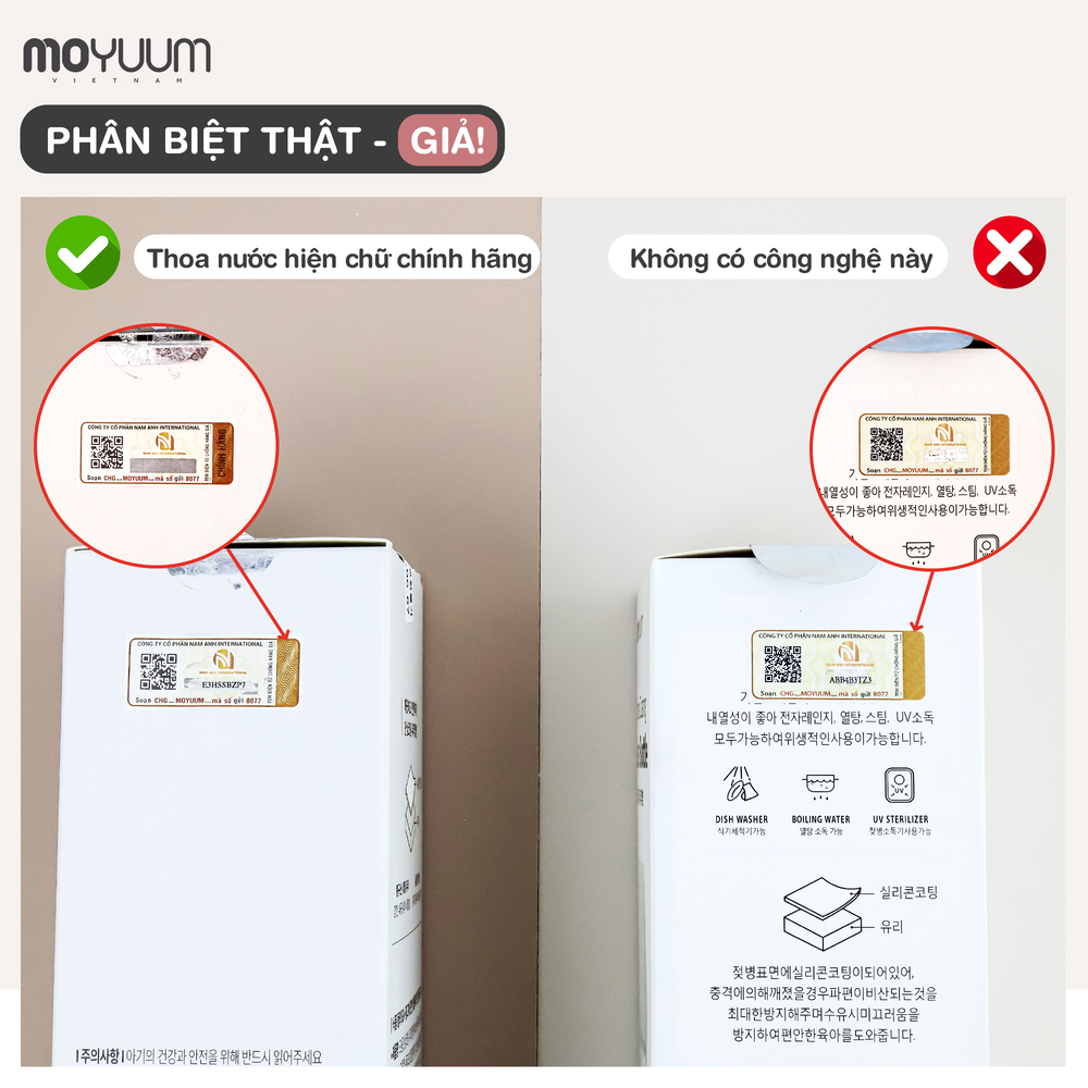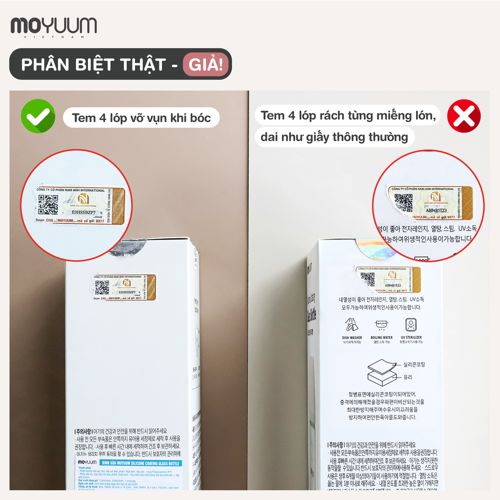Ngoài các đặc điểm lý tính, tem chống hàng giả của các sản phẩm bình thủy tinh Moyuum chính hãng còn được trang bị công nghệ kiểm tra SMS, áp dụng số hóa và hệ thống thông tin hiện đại, giúp người dùng dễ dàng truy xuất nguồn gốc sản phẩm.